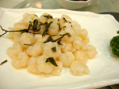 剥き海老を、龍井茶の葉っぱで炒めた杭州の名物料理です。