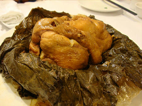 鶏の内臓を取り除いた中にきのこや野菜や豚肉などを詰めて、蓮の葉に包み、