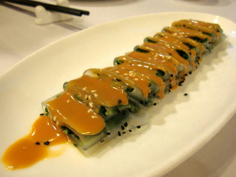 こんにゃくっぽい透明の生地で野菜を巻いて、味噌か何かのソースをかけたもの。